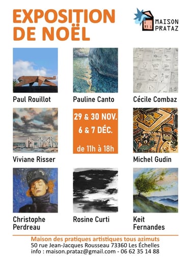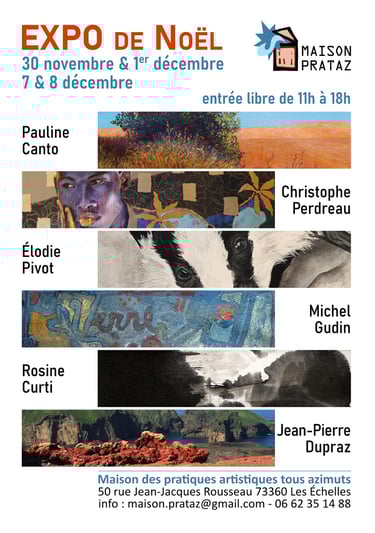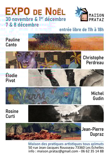 L'exposition de Noël rassemble cette année les œuvres de 8 artistes pendant 2 week-ends. Aquarelle, encre de Chine, pastel, gouache, peinture à l'huile, gravure et sculpture, chaque artiste vient avec son médium favori enchanter les murs de la Maison Prataz.